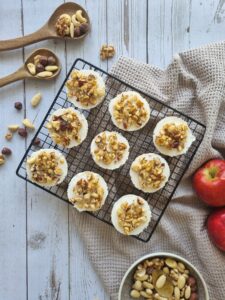 8. Verdeel de gekarameliseerde nootjes over de taartjes voordat je deze gaat serveren.
