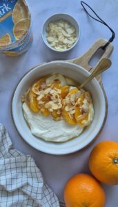Ingrediënten (voor 2 bowls) • 500 g Almhof Volle Kwark Spaanse Sinaasappel • 1 sinaasappel • 1 el ahornsiroop (+ extra voor drizzle) • 2 el amandelschaafsel • Optioneel: snufje kaneel of wat geraspte pure chocolade